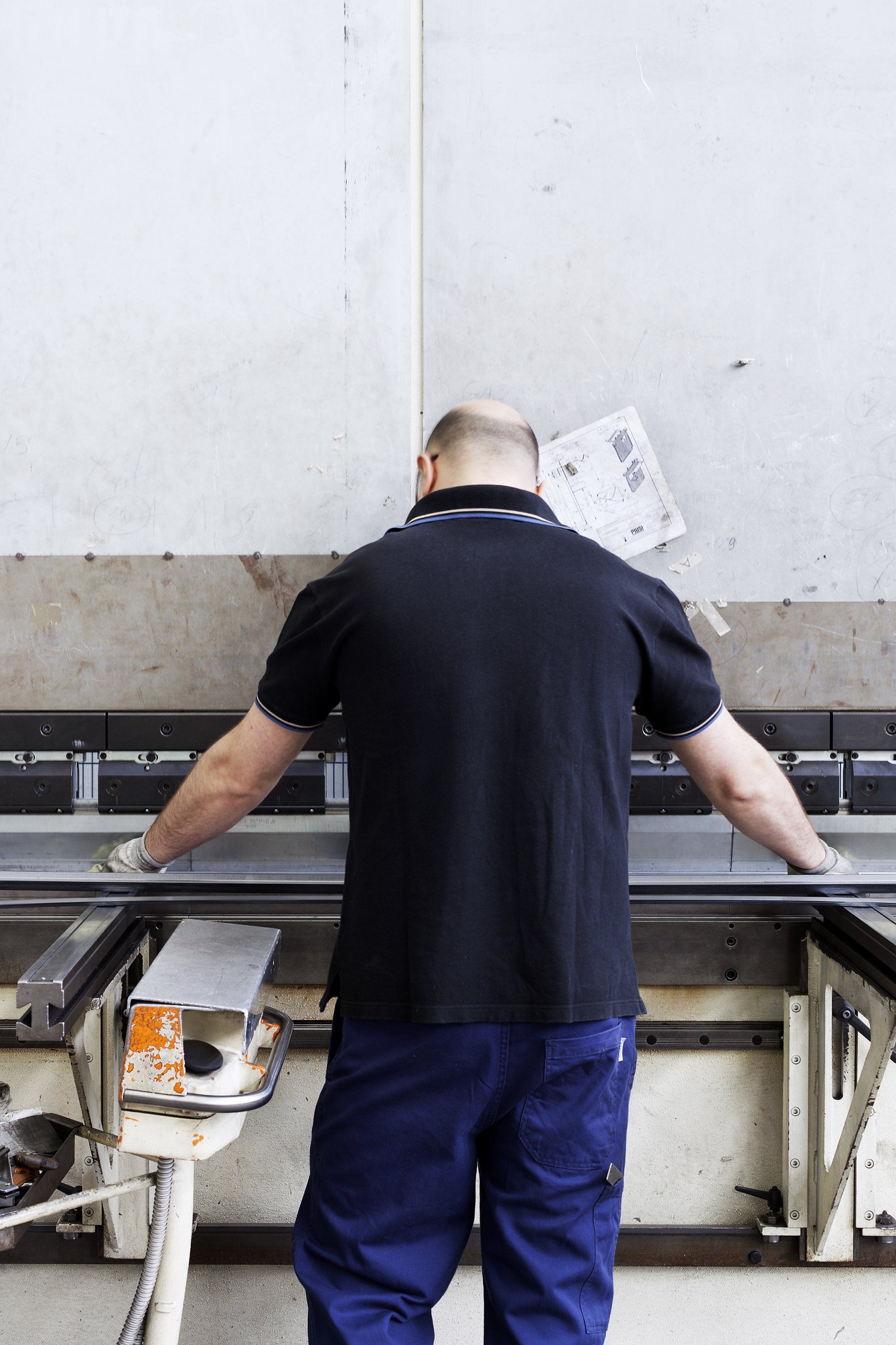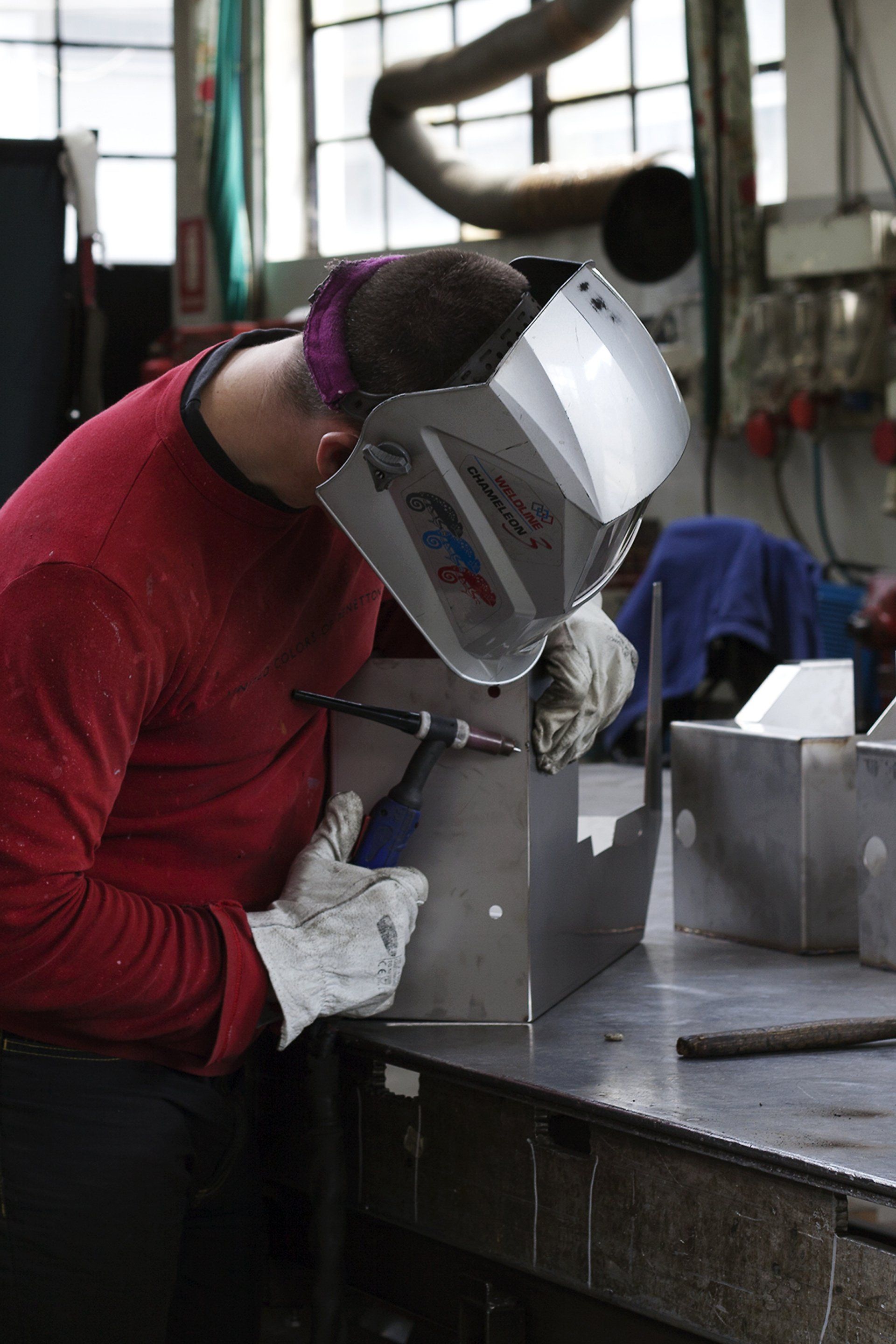Ciclo produttivo completo che prevede progettazione, taglio, piega, saldatura e assemblaggio.